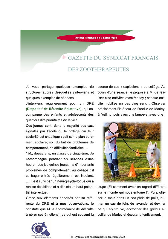 A la demande de François BEIGER, directeur de l'Institut Français de Zoothérapie (où j'ai suivi ma formation) et de Véronique BUOT, responsable de la communication à l'IFZ et également responsable du Syndicat Français des Zoothérapeutes (auquel j'adhère), j'ai écrit un article pour présenter mon parcours et ma pratique de zoothérapeute.
